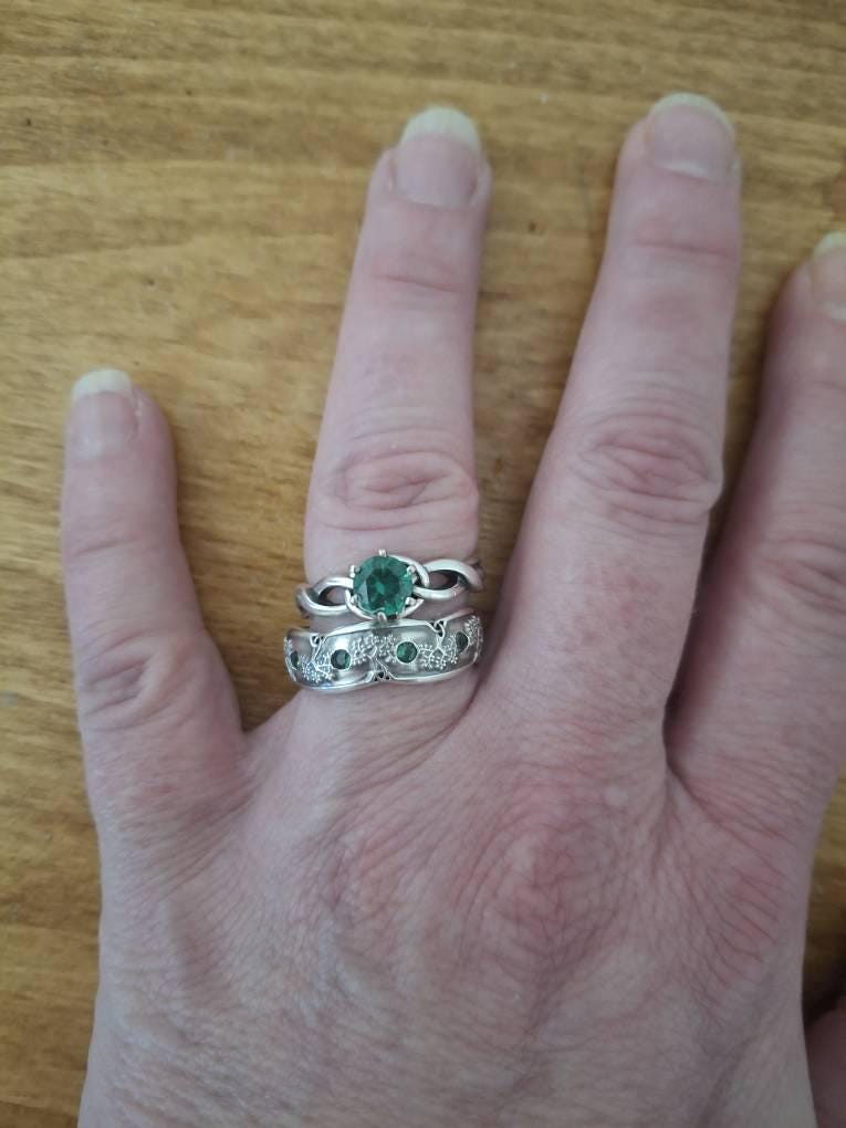 This His + Hers ring set features Trees of Life with Celtic trinity knots nestled at their base encircle this sterling silver wedding ring set. One ring features the tree of life bold and unadorned while the female ring is circled with sparkling emeralds.