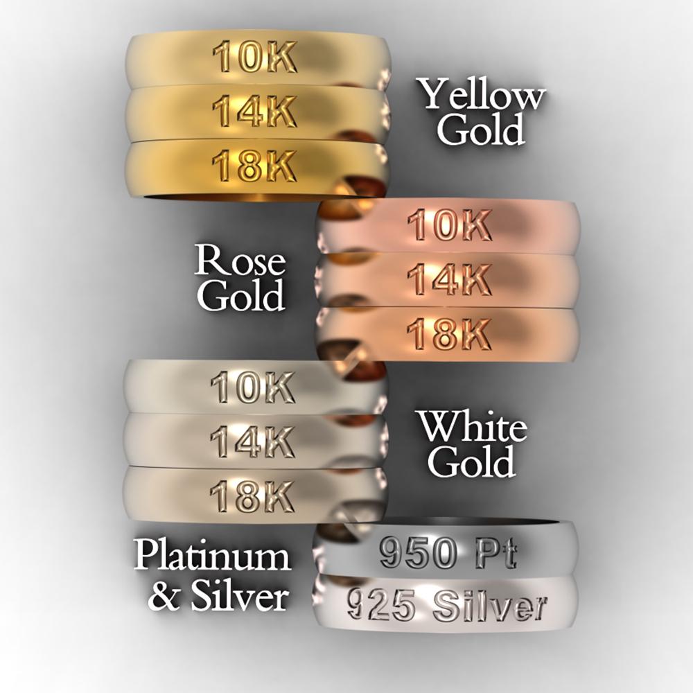 We can make any ring in sterling silver, gold (10K, 14K, 18K, yellow, white, or rose) or platinum. We do not offer tungsten, steel, or titanium.