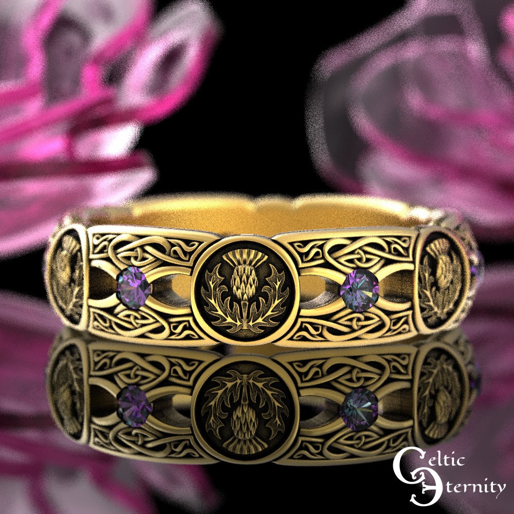 This intricate ring blends the Scottish Thistle with traditional Celtic heart knotwork pattern in a continuous, unbroken design. The thistle is associated with good luck, bravery, courage, and strength. Between the thistles are pairs of hearts poised symmetrically, above and below, representing the balance that beloveds offer each other in their relationship. On either side of the hearts, an open space forms an infinity sign binding the flowers in an unbroken pattern, a symbol of your lasting love, protected forever.