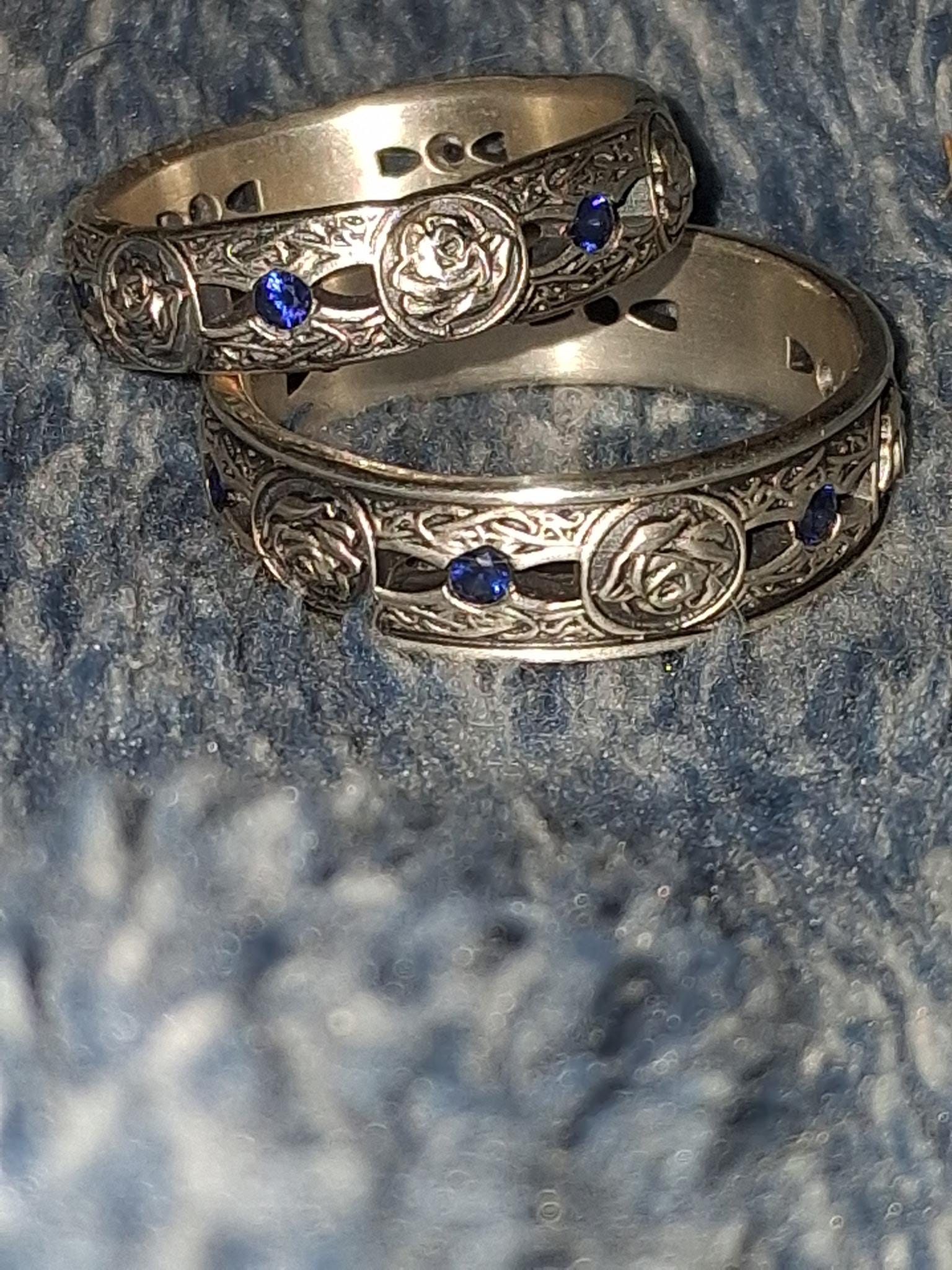Patina is a method of darkening metal through oxidation. This allows small details to stand out and gives the ring a beautiful contrast. Almost all our photos use patina.