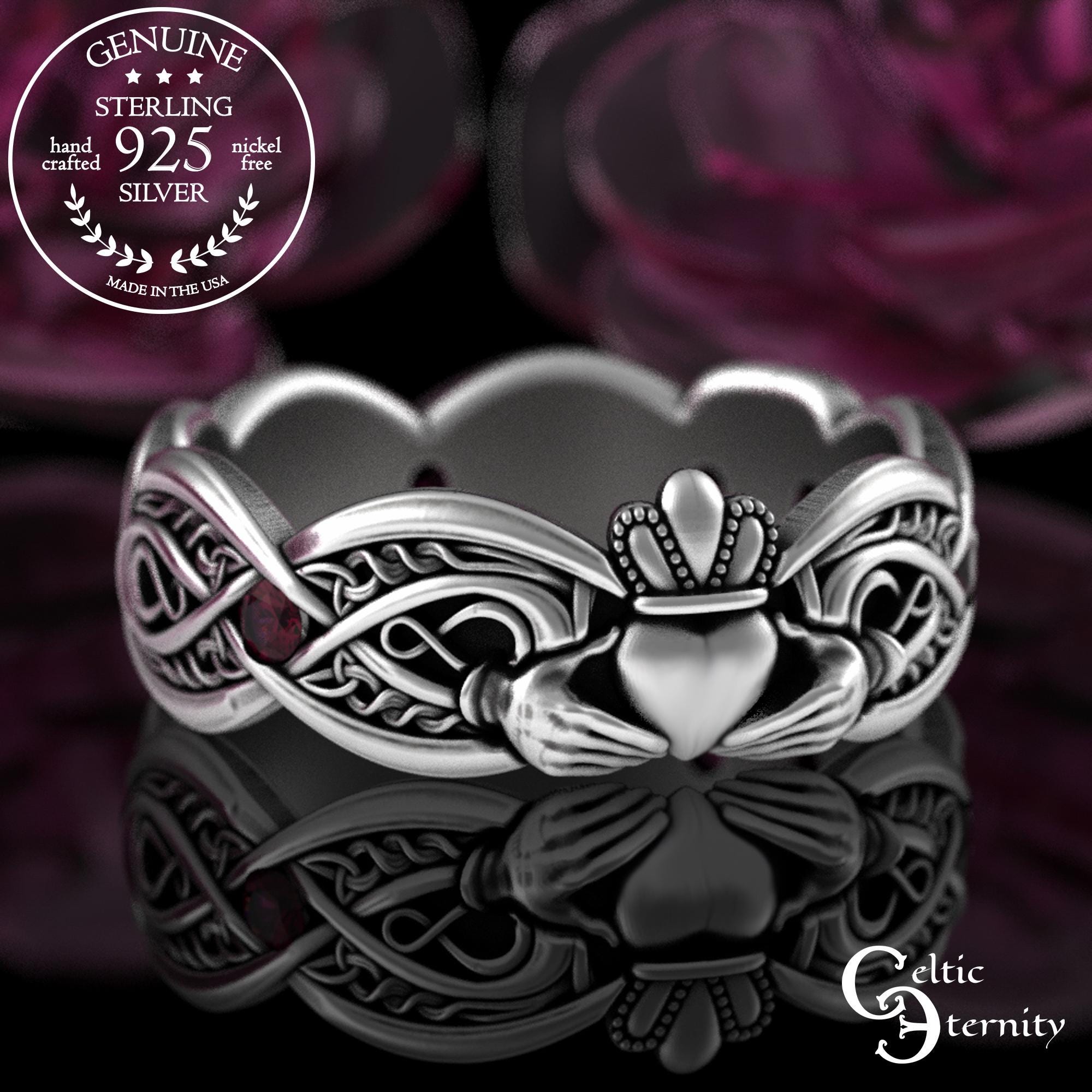 A delicate claddagh ring featuring intricate knotwork and infinity symbols, representing limitless love and infinite possibilities. Pairs of trinity knots, placed above and below, symbolize your two paths joined forever. The pattern goes all the way around the ring in an unbroken pattern, symbolizing your never-ending true love.