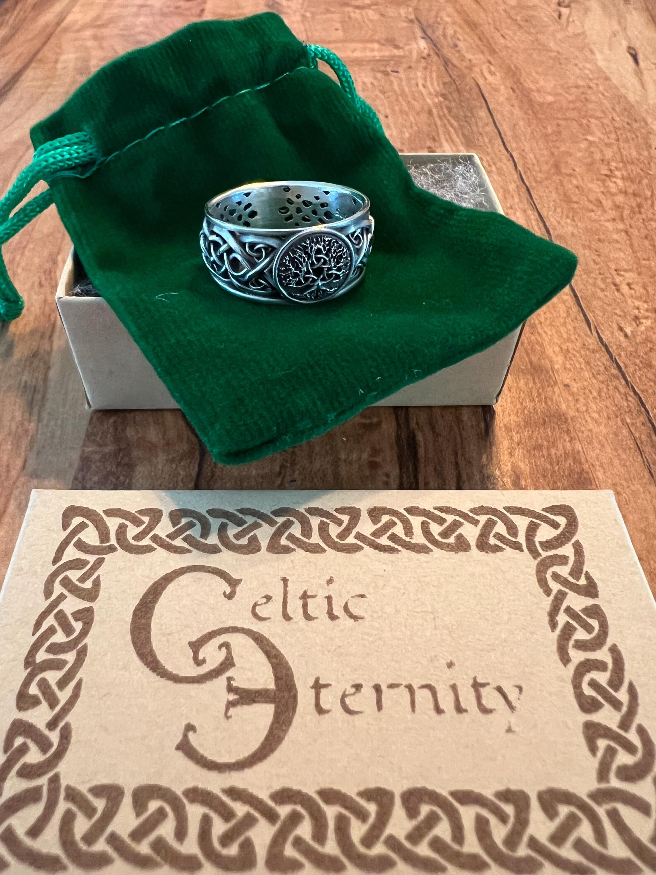 A stunning and bold Tree of Life adorns this sterling silver ring, woven from three Celtic Trinity Knots joined at its heart. Additional trinity knots bind and weave around the sterling silver band, symbolizing the continuous and intertwining nature of true love. The tree of life is sacred to many cultures and is a symbol of personal growth, strength and beauty. It represents our personal development, uniqueness and individual beauty. Just as the branches of a tree strengthen and grow upwards to the sky, we too grow stronger, striving for greater knowledge, wisdom and new experiences as we move through life.