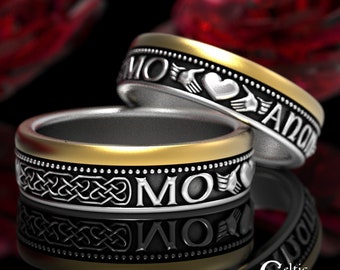 10K & Sterling Claddagh Rings, 2tone Gaelic Wedding Rings, Matching Celtic Heart Crown Weddings Rings, Gold Claddagh Wedding Ring Set, 1756